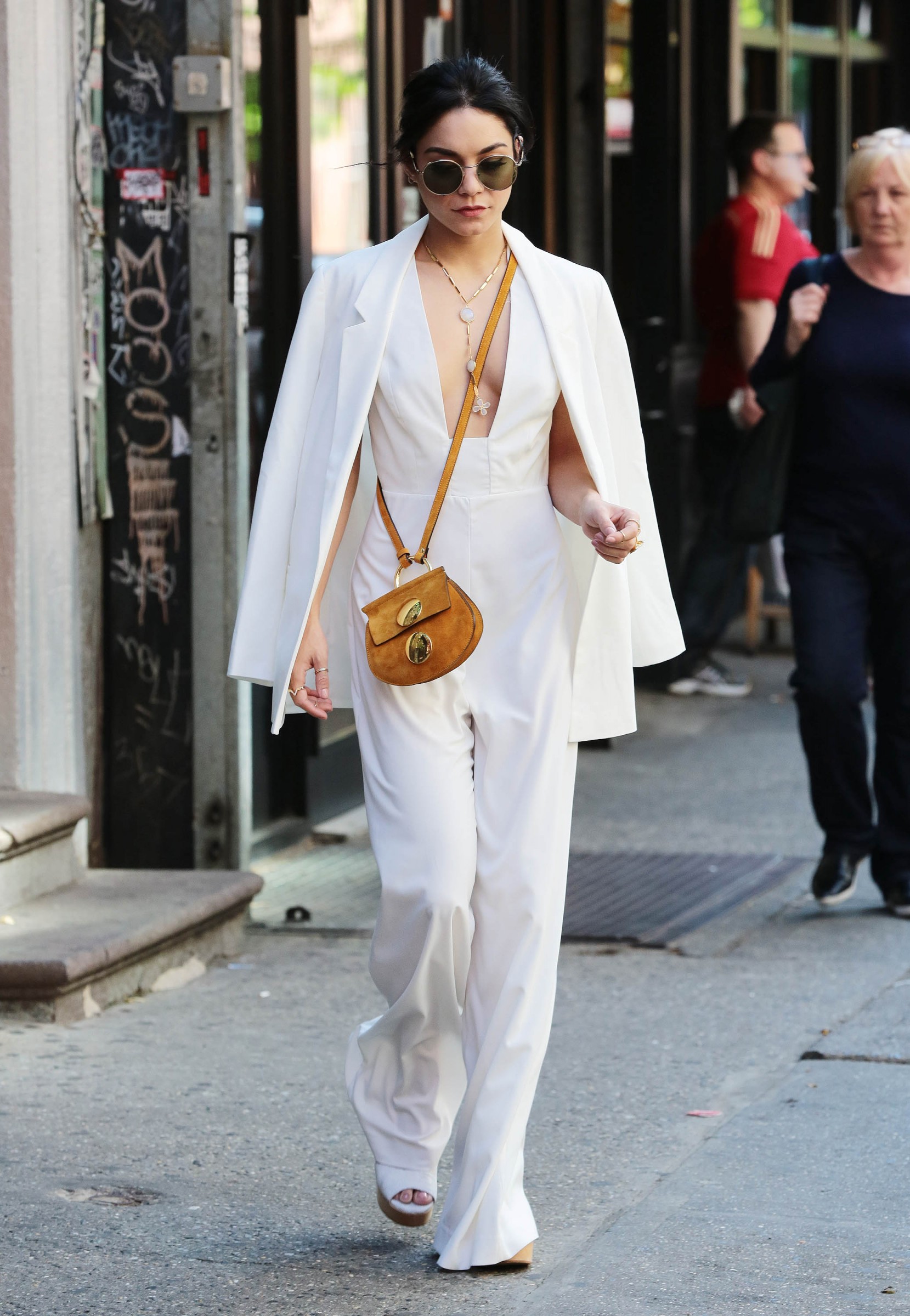 Need some inspiration for your summer outfit? What about an all white combination with brown accessories? Vanessa Hudgens combines a long white jumpsuit with a boyfriend blazer. She accessorizes her outfit with boho details like white clogs, round sunnies and a small Céline bag.